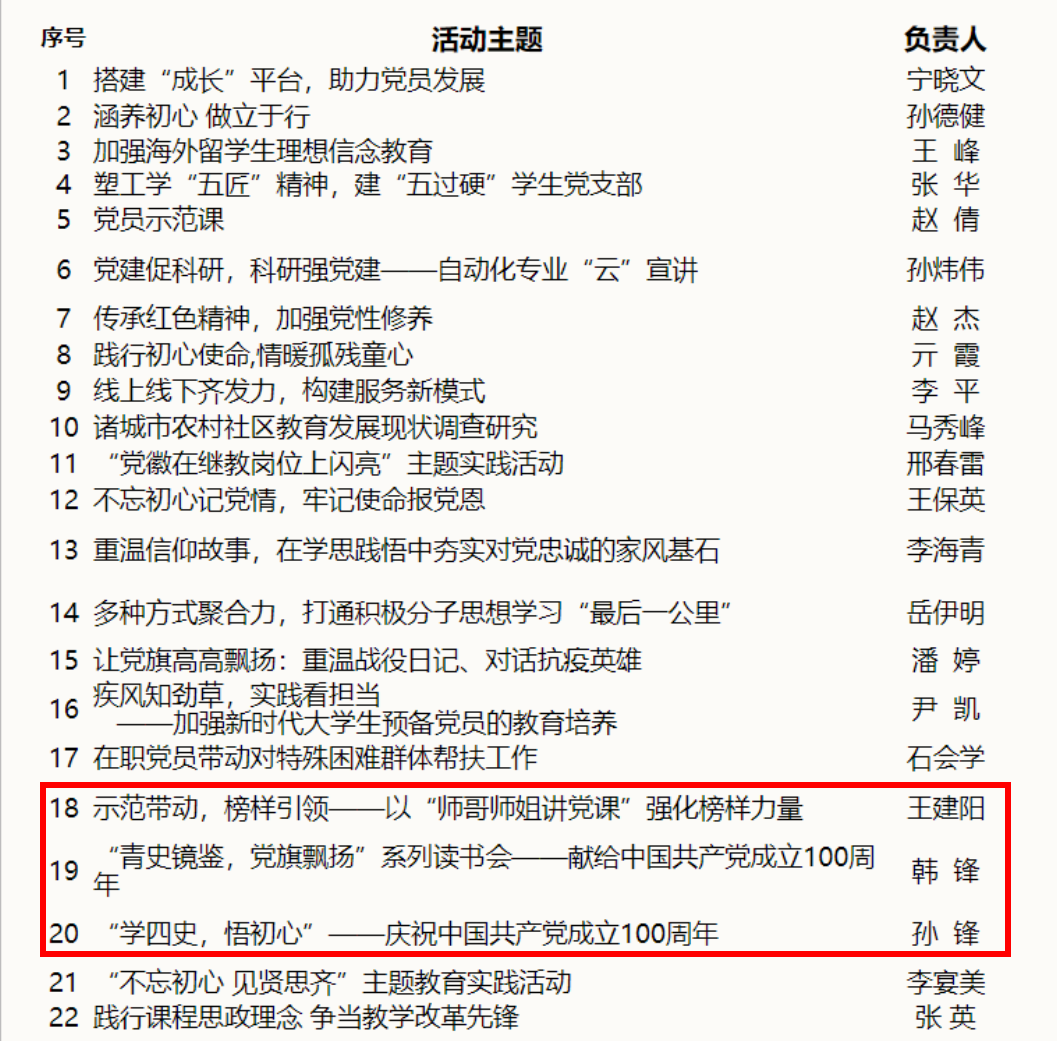 11月13日,学校党委组织部公布了2020年学校党建“双创”培育项目名单,共评选出4个党建工作标杆学院,工口动漫 党委入选党建工作标杆学院培育创建名单。同时,工口动漫 教职工党支部《“青史镜鉴,党旗飘扬”系列读书会——献给中国共产党成立100周年》、研究生党支部《“学四史,悟初心”——庆祝中国共产党成立100周年》、本科生党支部《示范带动,榜样引领——以“师哥师姐讲党课”强化榜样力量》三个方案入选党支部创新活动方案立项名单。