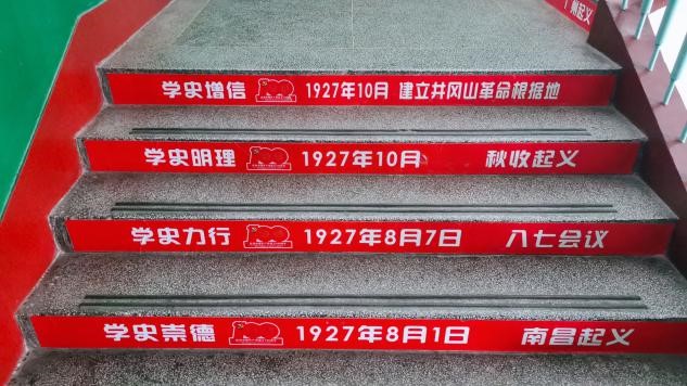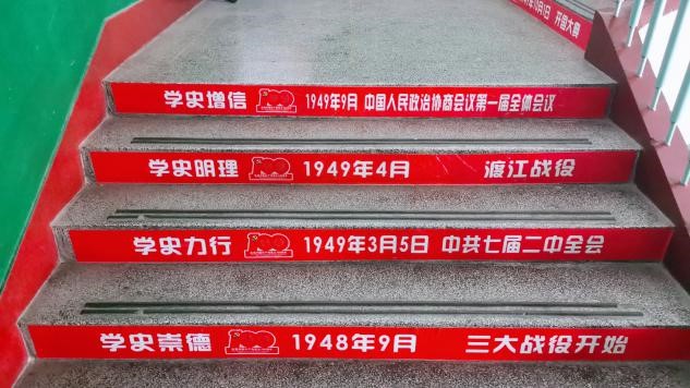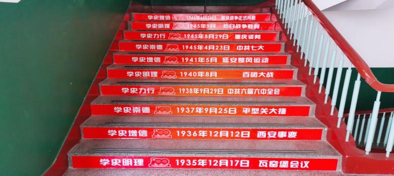 近日,工口动漫 创新党史学习形式,拓宽党史学习途径,将党史学习融入到日常生活之中。组织学生利用专业知识整理中国共产党成立以来的重大历史事件,利用楼道楼梯,在每层台阶上贴上对应年份的党的历史大事件,自1921年建党之初到2021年百年华诞,步步台阶,重走百年。引导师生学习、了解中国共产党筚路蓝缕、奠基立业的百年历程,教育师生坚定爱党爱国信念。掀起了新一轮党史学习热潮,营造了学院浓厚的党史学习氛围,取得良好的党史学习效果。