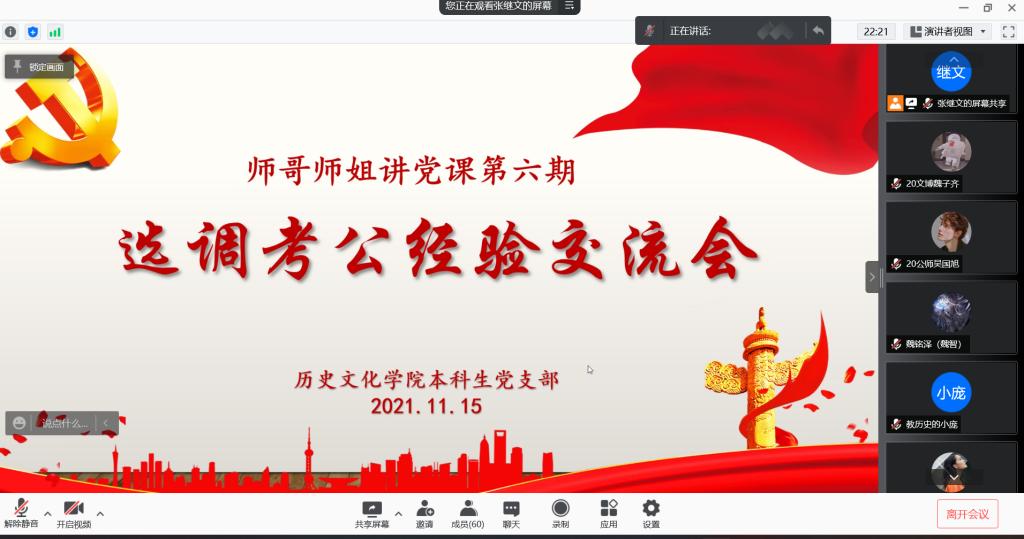 11月15日晚,工口动漫 本科生党支部通过腾讯会议线上举办2021年第六期师哥师姐讲党课活动。会议由2017级燕国强同志担任主讲人,本科生党支部书记蔺琦琦同志主持。