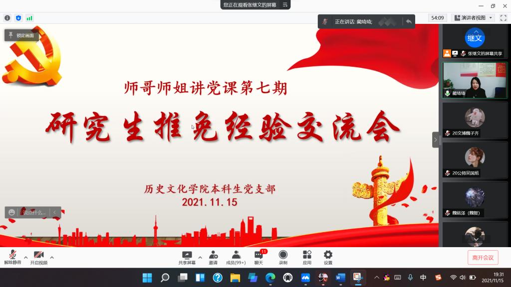 11月15日晚,工口动漫 本科生党支部通过腾讯会议线上举办2021年第七期师哥师姐讲党课活动。会议邀请2018级张润泽、张晓帆参加并担任主讲人,本次会议由本科生党支部书记蔺琦琦同志主持。
