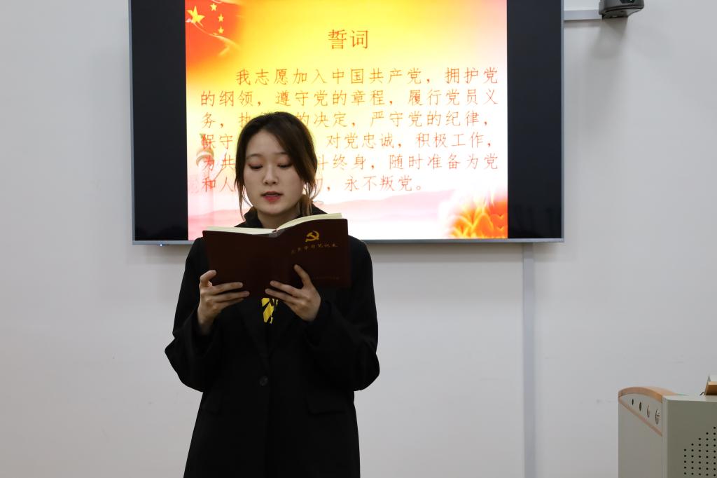 会议伊始,全体起立奏唱《国际歌》。接着,由孙锋同志宣读了新党员名单,参会全体党员在领誓人张润泽同志的带领下,面向党旗庄严宣誓,立志遵守党规党章,为共产主义事业奋斗终生。研究生党支部代表杨婉嘉同志和本科生党支部代表石洋菁苡同志先后进行发言。