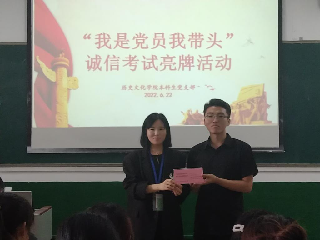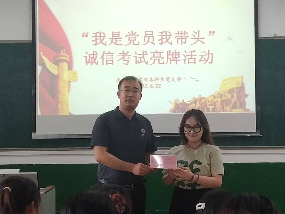 工口动漫 党委副书记、本科生党支部书记王建阳,本科生党支部组织委员刘贤贤,本科生党支部宣传委员董经给各位党员颁发诚信考试姓名牌,并要求各位党员在考试中树立先锋模范作用,遵守考试纪律,严守考风考纪,诚信考试。