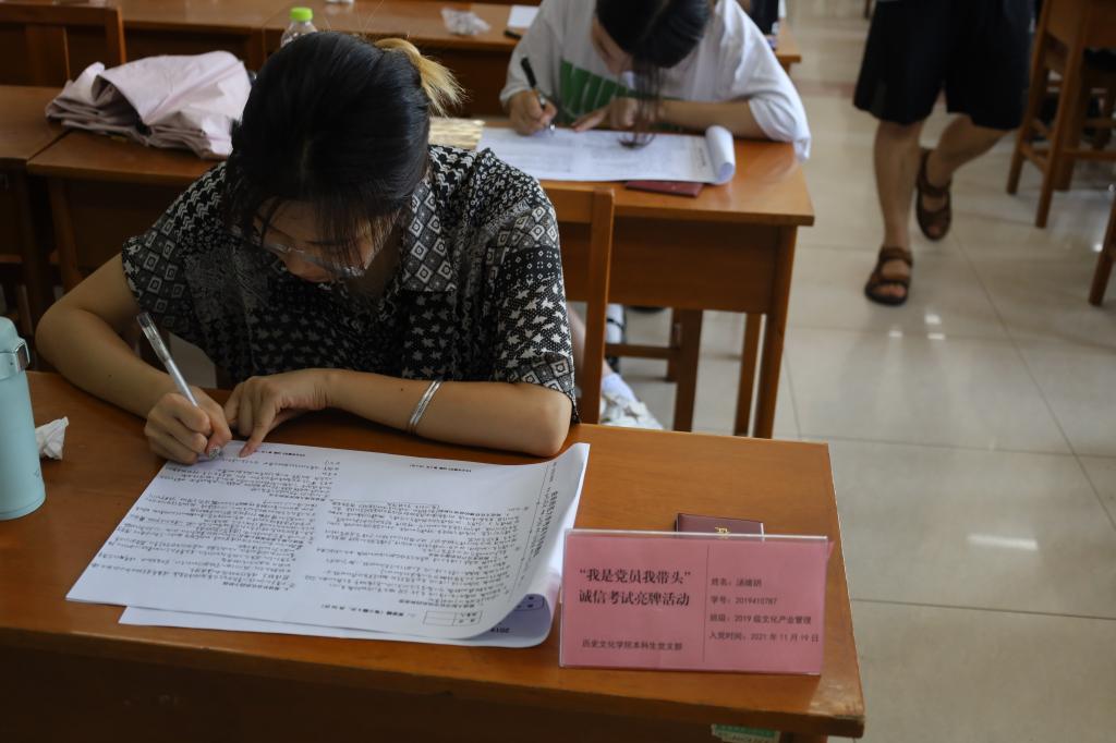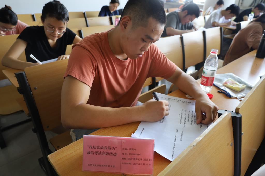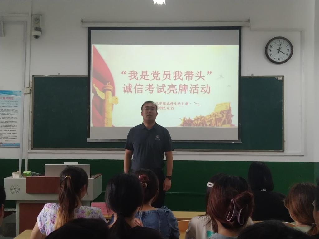 2022年6月22日下午,工口动漫 本科生党支部在文史楼309教室召开“我是党员我带头”诚信考试亮牌活动,会议由本科生党支部宣传委员董经主持,本科生党支部全体在校党员参加。