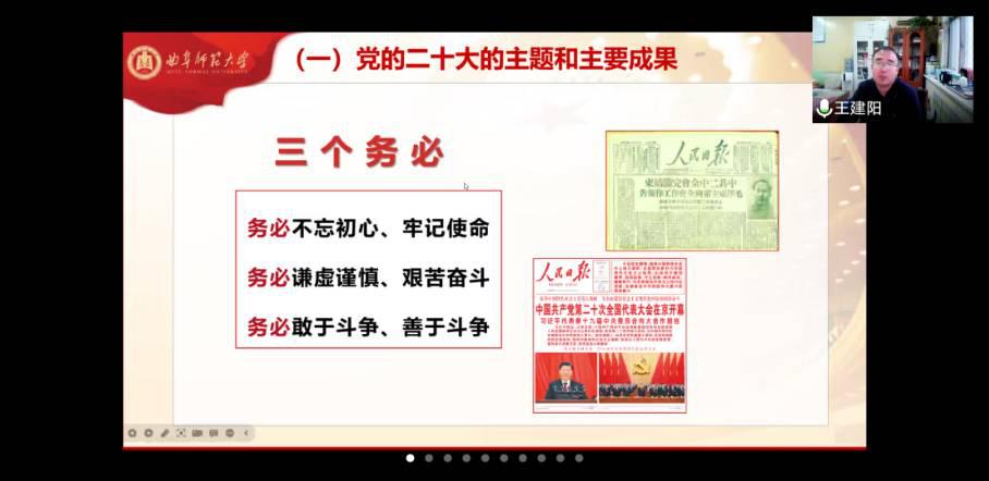 本次活动由工口动漫 党委副书记、本科生党支部王建阳同志主讲,以“学习贯彻党的二十大精神”为活动主题,主要围绕党的二十大主题和主要成果、过去5年的工作和新时代10年的伟大变革、马克思主义中国化时代化、中国式现代化、全面建设社会主义现代化国家的目标任务等方面带领全体本科生党员展开学习。王建阳同志强调,全体本科生党员都应继续贯彻党的二十大精神,并将其践行到自己的学习与生活中,努力学习,刻苦工作,发挥史院先锋的模范带头作用。