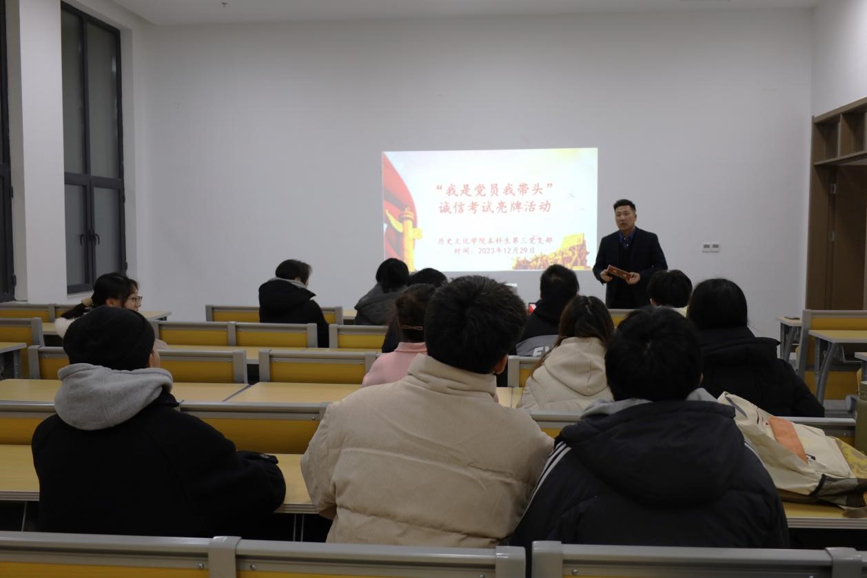 为引导广大学生培养正确的考试观念,维护考试纪律。2023年12月29日,工口动漫 本科生第三党支部于孔子书院B106召开十二月份主题党日活动暨“我是党员我带头”诚信考试亮牌活动。活动由本科生第三党支部书记董经同志主持,本科生第三党支部全体成员参加。