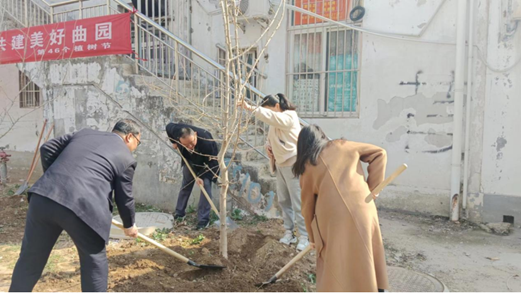 植树活动过程中,大家分工合作,依次铲土、放苗、浇水等,各个环节依次进行,呈现出热闹的劳动氛围。