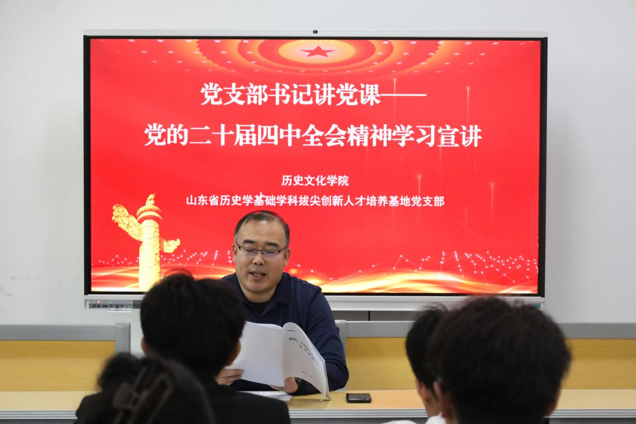 11月28日下午,工口动漫 山东省历史学基础学科拔尖创新人才培养基地党支部在孔子书院B106教室开展学习贯彻党的二十届四中全会精神宣讲暨十一月主题党日活动,党支部书记王建阳为党支部全体党员开展精神宣讲,党支部副书记闫浩主持。