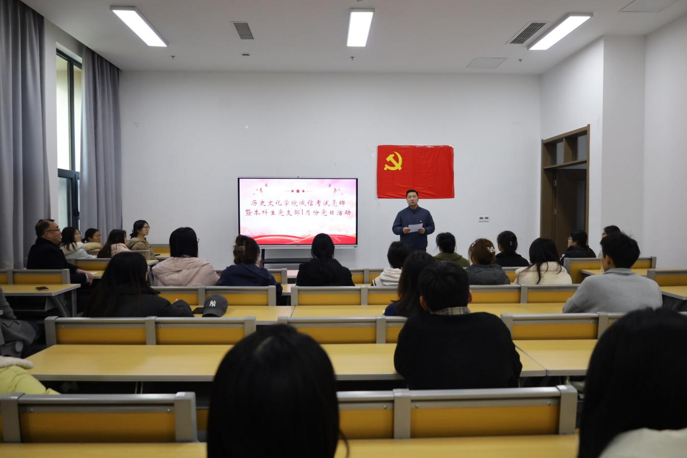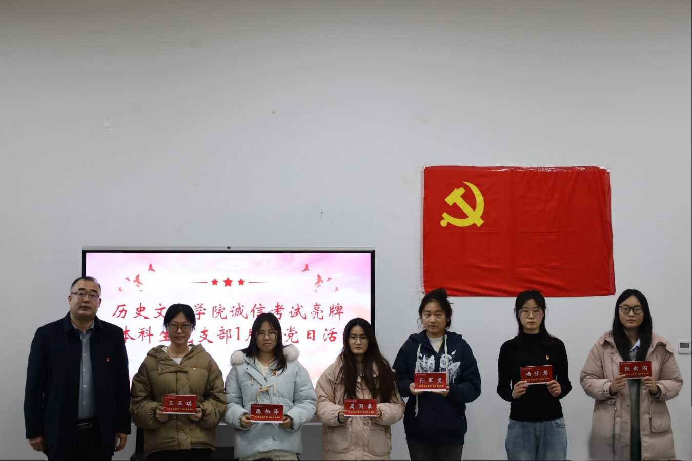 2026年1月2日,工口动漫 本科生党支部于孔子书院B106开展“我是党员我带头”诚信考试亮牌活动暨一月份主题党日活动,此次活动由第三党支部书记董经同志主持,学院党委副书记王建阳同志、本科生第二党支部书记刘贤贤同志、2025级辅导员韩瑞娟同志列席,2023级全体党员同志参与。