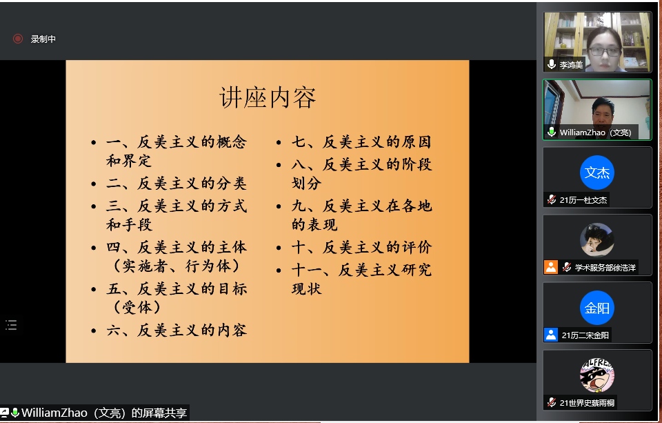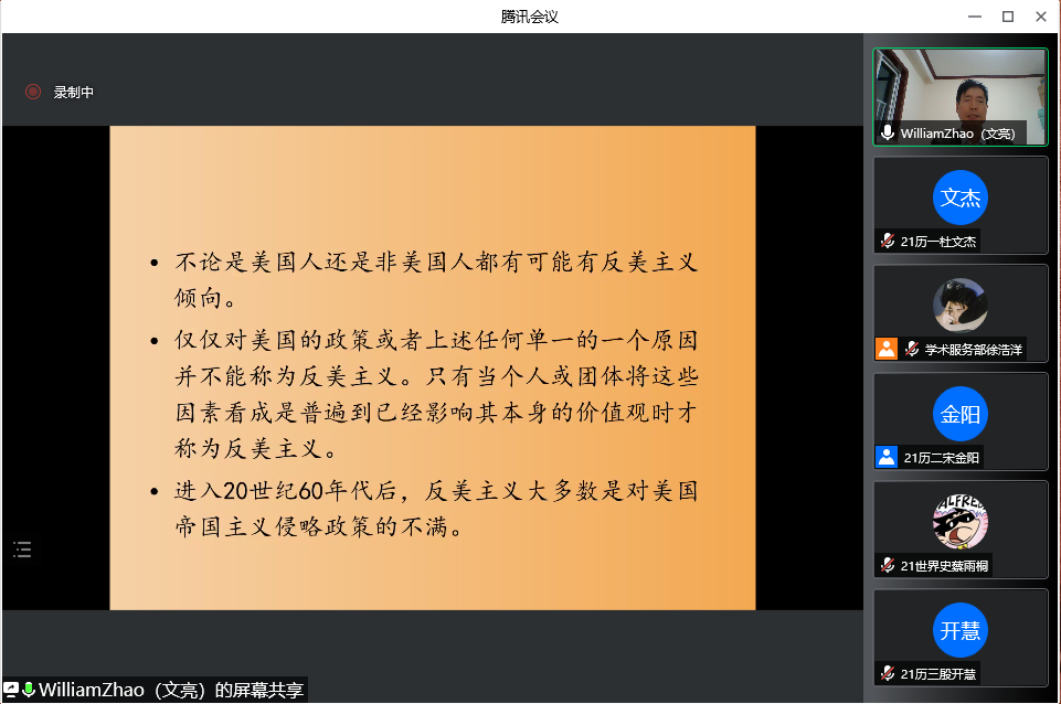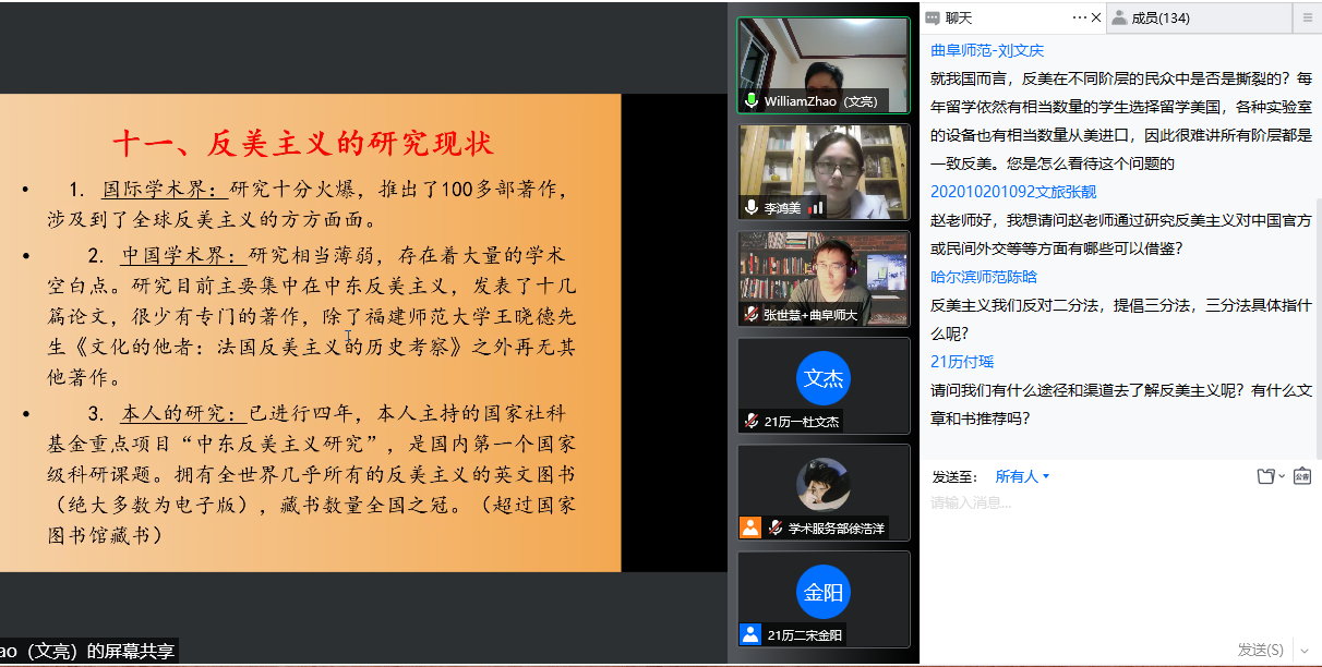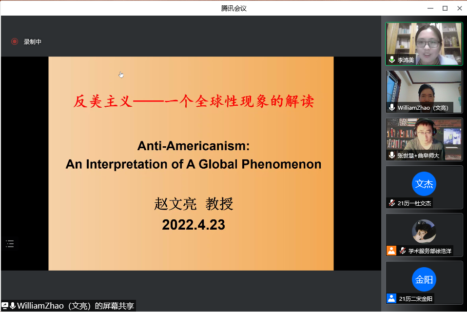4月23日晚,工口动漫 教授、博士生导师赵文亮作客“洙泗讲堂”,通过腾讯会议视频为我校师生作了题为“反美主义——一个全球性现象的解读”的学术报告。报告会由工口动漫 李鸿美副教授主持并做评议人,工口动漫 相关专业师生及来自全国各地的听众共100余人进行了在线收看,讲座内容十分丰富和精彩。