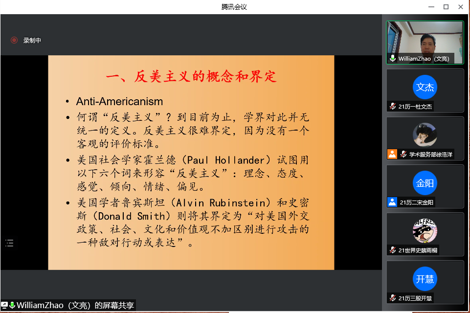 讲座分十一部分进行。第一部分是反美主义的概念和界定,赵文亮教授简要介绍了“反美主义”与“美国化”之间的联系,继而指出目前对于“反美主义”,学界很难给出一个统一的定义。从实质上看,反美主义是一种全球现象,反映了世界各国对美国在国际事务中称王称霸的不满,也体现了对美国大众文化向外扩张的抵制。他从广义和狭义两个方面对反美主义进行区分,并指出反美主义有三个层次:由低到高依次为反美思潮——反美行动——反美政权。
