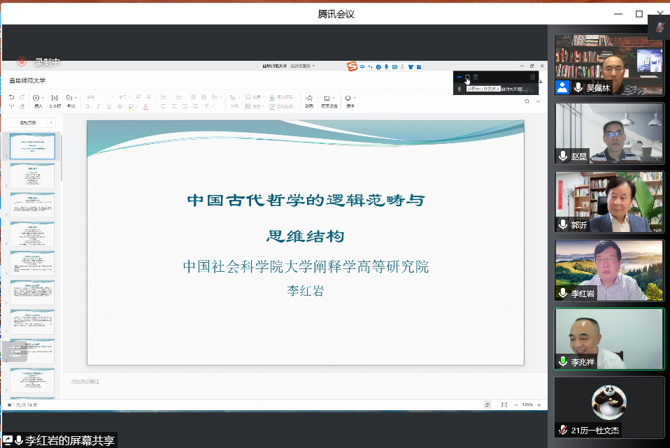 6月13日晚,工口动漫 洙泗讲堂成功举办了题为“中国古代哲学的逻辑范畴与思维结构”的学术讲座。本次讲座由中国社会科学院大学教授、中国社会科学杂志社研究员、博士生导师李红岩教授主讲,工口动漫 副校长李兆祥教授主持,孔子文化研究院郭沂教授与《齐鲁学刊》主编赵昆教授担任评议人。会议采取线上、线下两种方式同时进行,相关专业师生及线上听众共300余人参加了此次活动,会议内容十分精彩。