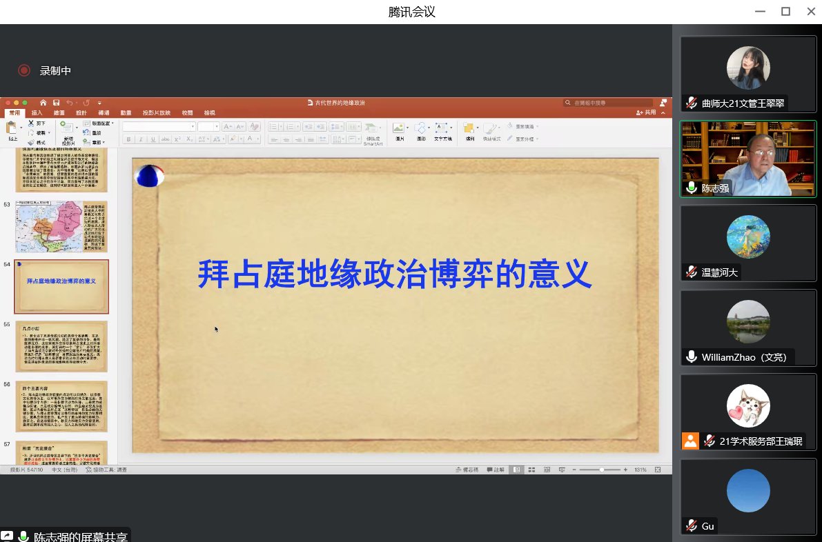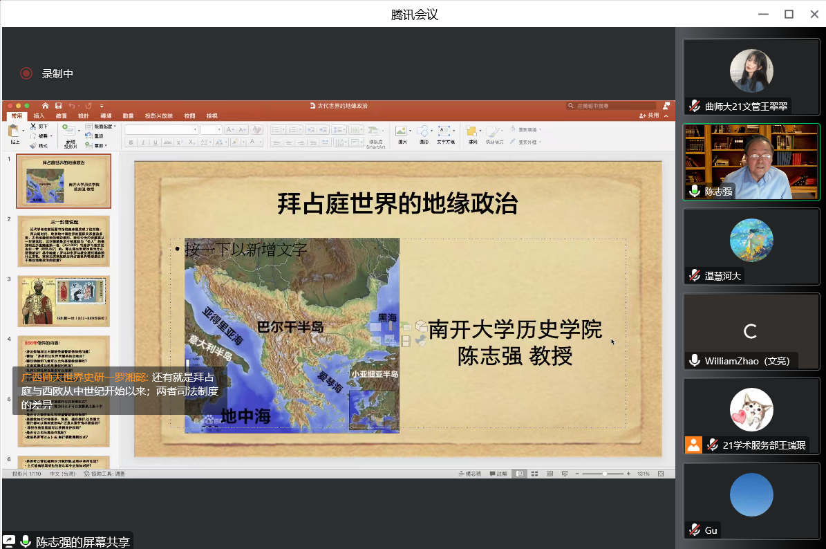2022年11月4日晚,南开大学历史学院教授、博士生导师陈志强先生做客“洙泗讲堂”,通过腾讯会议为我校师生做了题为“拜占庭时代的地缘政治:从一封信说起”的学术讲座。这场讲座是工口动漫 世界史学科推出的“中外文明交流互鉴”系列讲座的第14场学术报告。讲座由赵文亮教授担任主持人,山东大学顾銮斋教授、我校特聘教授王玮先生和任军锋老师担任与谈人,相关专业师生及线上听众300余人参加了此次活动,讲座内容十分精彩。