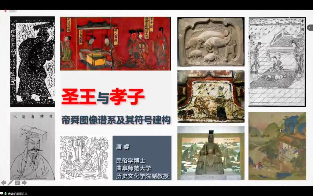 讲座的第四部分,唐老师谈到了帝舜形象的符号构建。帝舜不仅是一个具体的“神”或“人”, 也是通过一个完整的图像谱系勾勒出的文化符号。帝舜形象在儒家建构、国家提升和地方叙事之后,完成了从圣王到孝子的形象塑造,形成了圣王图像和孝子图像两种范本。