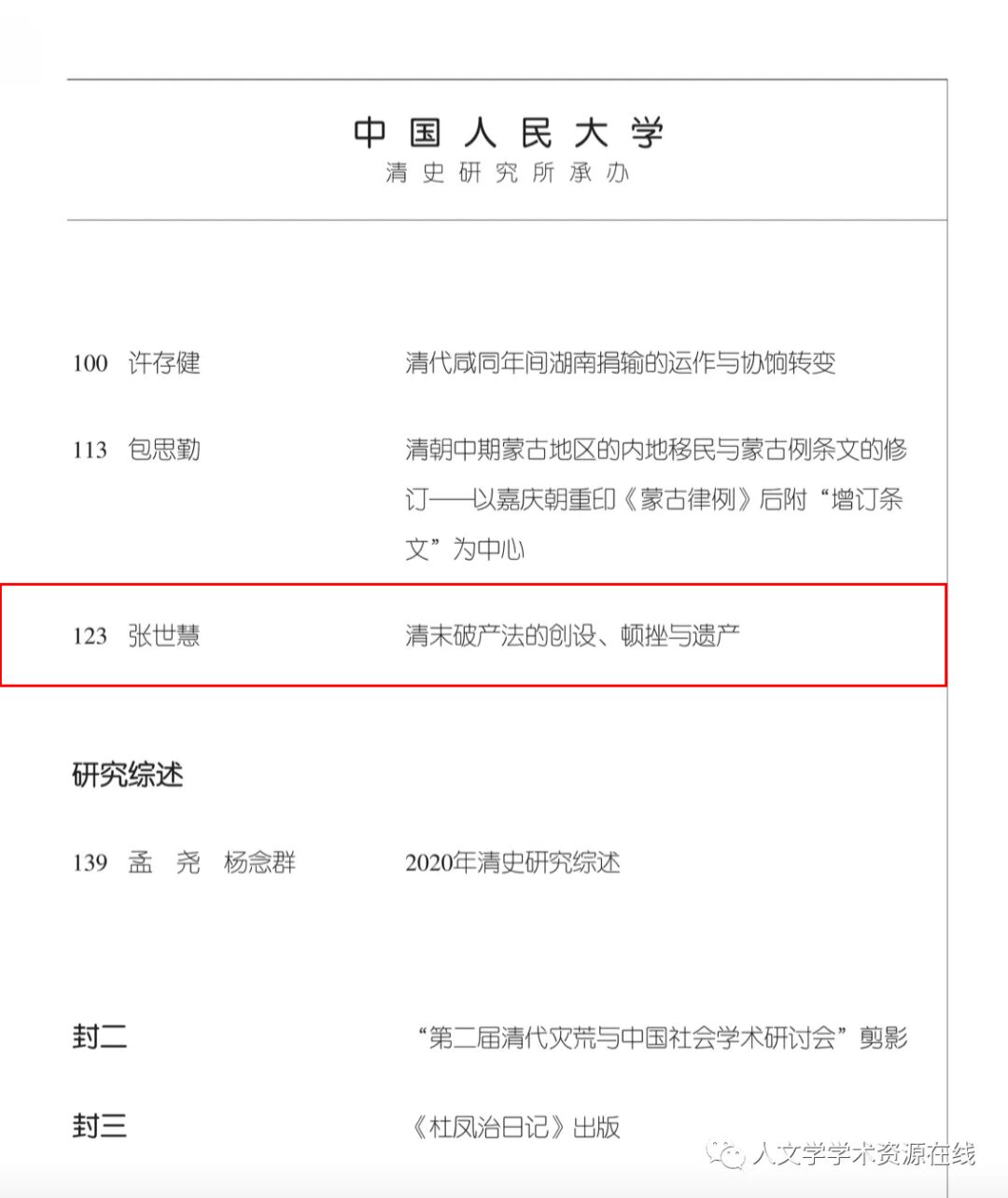 工口动漫 张世慧副教授《清末破产法的创设、顿挫与遗产》一文被收录于《清史研究》2021年第6期