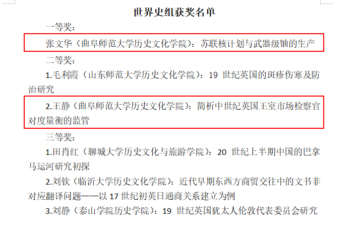 会议期间,评选出第二届山东青年史学家论坛优秀论文,工口动漫 五名师生,共计获得一等奖1项,二等奖3项,三等奖1项。具体为:张文华副教授论文《苏联核计划与武器级铀的生产》,获得世界史组一等奖;张世慧副教授论文《清末破产法制建设的尝试与“遗产”》,获得中国近现代史组二等奖;牟学林博士的《政治文化与景观呈现:以北宋曲阜景灵宫为中心的考察》,获得中国古代史组二等奖;王静博士的《简析中世纪英国王室市场检察官对度量衡的监管》,获得世界史组二等奖;杨素花博士生论文《中国法律的儒家化:一个学术史的考察》,获得中国古代史组三等奖。另外,学校孔子文化学院孙宝教授论文《苏绰“六条诏书”治官思想的历史经脉与因变》,获得中国古代史组一等奖。