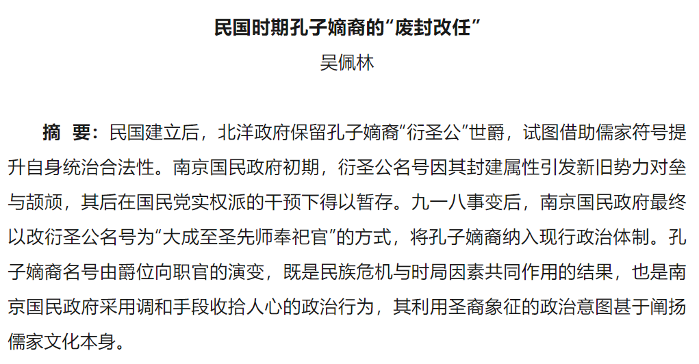 自清朝被推翻,建立民国开始,世袭贵族在中国基本消失,直到南京民国政府后,改封“衍圣公”孔德成为大成至圣先师奉祀官停止。吴佩林教授的论文以孔子嫡裔的“废封改任”为研究对象,认为民国政府利用孔子嫡裔的名号由爵位向职官演变,其政治意图甚于阐扬儒家文化本身。民国建立后,北洋政府保留孔子嫡裔“衍圣公”世爵,试图借助儒家符号提升自身统治合法性。南京国民政府初期,衍圣公名号因其封建属性引发新旧势力对垒与颉颃,其后在国民党实权派的干预下得以暂存。九一八事变后,南京国民政府最终以改衍圣公名号为“大成至圣先师奉祀官”的方式,将孔子嫡裔纳入现行政治体制。孔子嫡裔名号由爵位向职官的演变,既是民族危机与时局因素共同作用的结果,也是南京国民政府采用调和手段收拾人心的政治行为,其利用圣裔象征的政治意图甚于阐扬儒家文化本身。