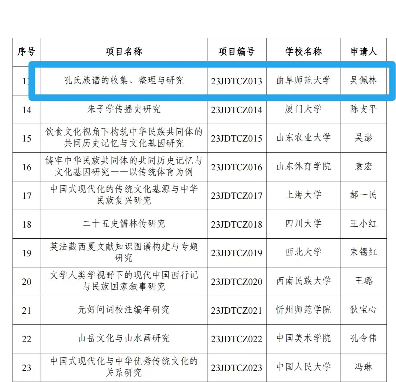 吴佩林教授主持的“孔氏族谱的收集、整理与研究”重大课题将系统搜集和整理海内外现存孔氏族谱,并在既有研究的基础上展开扎实研究。预期成果分“整理编”和“研究编”两大部分,逾2000万字。对数量庞大的孔氏族谱的收集、整理、研究与出版,将会极大丰富孔府研究的史料来源,使其与档案、碑刻形成一个相互支撑、多维共证的文献群,对于赓续历史文脉、助力中华优秀传统文化传承发展具有重大意义。中华优秀传统文化专项课题是贯彻落实习近平总书记关于弘扬中华优秀传统文化的系列重要讲话精神,践行"两个结合",推动文化"两创"的重要举措。其评审结果体现了教育部对于弘扬中华优秀传统文化的重视和支持。