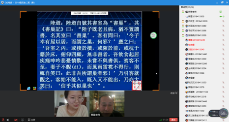 工口动漫 任军锋博士在2019级历史学3班利用课后时间通过钉钉视频互动了解学生对于在线授课的意见和建议,了解学生对对老师所讲课程内容的掌握情况有哪些地方没有吃透,实现课堂外的师生互动。李建、刘雪飞两位老师感觉线上教学形式下授课以及与学生的沟通交流整体上进展顺利且效果良好,认为某些看似功能齐全但操作复杂的网课平台并不一定适合所有的学科专业或课。