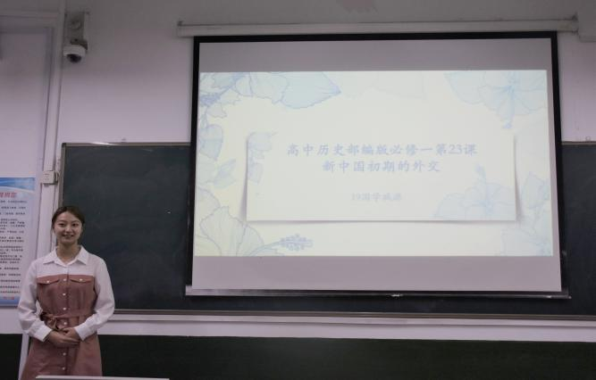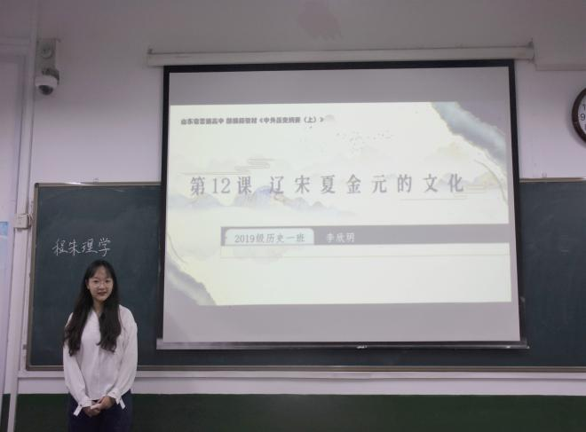 比赛以模拟授课的方式,从教学模式、教学语言,课堂内容等多方面对参赛选手进行综合考察。选手们以程朱理学、新中国的成立、台儿庄大捷等中学历史热点为着眼点,通过课件展示与板书设计,详细地讲述了课程内容,讲课过程条理清楚,充分展示了自己的专业知识和教学基本功。最后,19历一的李欣玥同学挺进决赛,评委老师们对比赛及选手表现做出详细点评,鼓励同学们在扬长避短的同时继续努力。