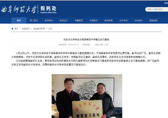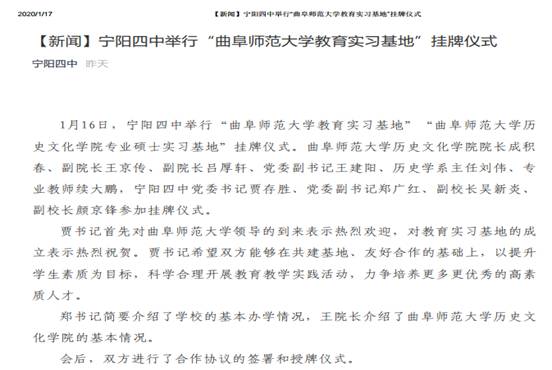 1月16日上午,工口动漫 在宁阳县第四中学举办教育实习基地揭牌仪式。宁阳县第四中学党委书记贾存胜、副书记郑广红、副校长吴新炎和颜景锋,工口动漫 院长成积春、副院长王京传、党委副书记王建阳、副院长吕厚轩、历史学系主任刘伟、工会委员续大鹏参加揭牌仪式。