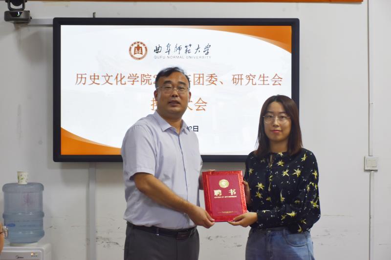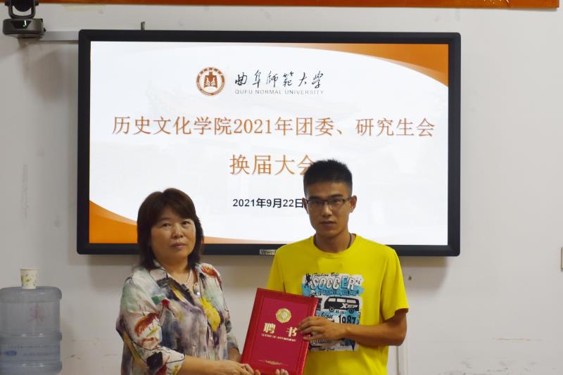 大会在庄严的国歌声中拉开序幕。按照大会议程,学院2020届研究生会主席孙永健首先代表2020届团委、研究生会向大会作述职报告;随后,王建阳、吕厚轩、孙锋、李春玲等老师为学院2020届研究生会主要学生干部颁发荣誉证书;2020届团委副书记兼研究生会副主席田蕾宣读了学院2021届团委、研究生会主要学生干部名单;学院2020届研究生会主席团成员与2021届主席团成员交接并合影留念;2021届研究生会主席焦洋代表新一届团委、研究生会全体成员进行了表态发言。