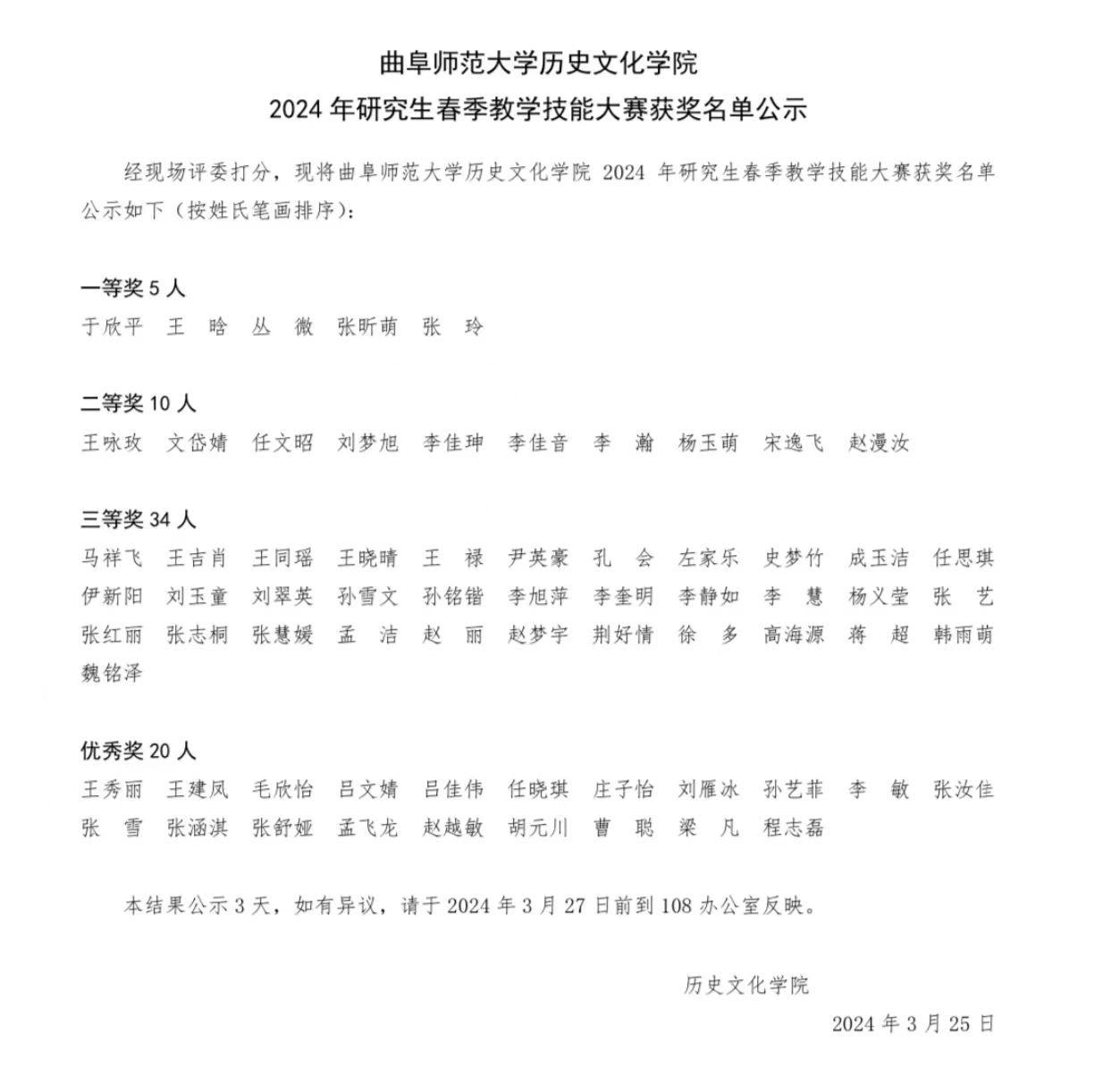 3月24日,工口动漫 2024年研究生春季教学技能大赛决赛在西区格物楼B103教室举行,曲阜师大附中高级教师刘茂森及学院姜修宪、李鸿美、江海云、史慧佳、孙锋等老师担任评委,研究生张涵淇担任主持人。评委们尽心尽责,遵循公开、公平、公正的原则,从教态与表达、教学效果、个人特色等方面进行评分,最终评选出一、二、三等奖和优秀奖。