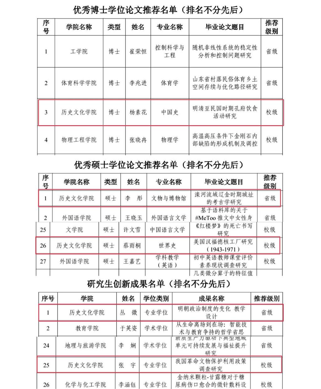 在此次推荐名单中,2020级中国史专业博士生杨素花《明清至民国时期孔府饮食活动研究》入选校级优秀博士学位论文;2021级文物与博物馆专业硕士生李彤《滦河流域辽金时期城址的考古学研究》推荐省级优秀硕士学位论文;2021级世界史专业硕士生蔡雨桐《美国汉福德核工厂研究(1943-1971)》入选校级优秀硕士学位论文;2023级学科教学(历史)专业硕士生丛微《明朝政治制度的变化教学设计》推荐省级研究生创新成果;2023级文物与博物馆专业硕士生张宇《我国革命文物保护利用政策调查研究》入选校级研究生创新成果;樊友猛副教授主持的《全球文明倡议视域下的文物外交实践》推荐省级优质专业学位案例库;张文华副教授主持的《新文科视域下世界史专业研究生课程思政教学改革与实践研究》推荐省级面上教学改革项目;张田生副教授主持的《新文科背景下历史学研究生学位论文选题与文献对比阅读》入选校级教学改革项目。