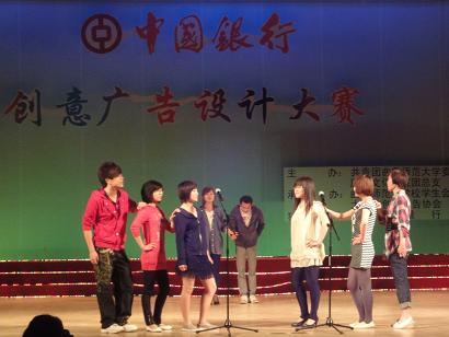 一段动感十足的开场舞拉开了本次决赛的序幕,决赛共分两个环节:平面广告秀和广告真人秀。在“平面广告秀”环节中,各参赛队伍均围绕着“中国银行校园淘宝卡”的主题设计广告,以PPT、FLASH和DV等形式表现各自富有创意的构思;在“广告真人秀”环节中,各参赛队伍的作品均围绕着校园生活展开,以话剧、小品等形式加以呈现,内容均涉及了中国银行校园淘宝卡,选手们所展示的贴近生活的节目、多才多艺的演出以及独具匠心的表现方式,赢得了在场观众的阵阵喝彩。穿插在比赛过程中的抽奖环节,点燃了观众们的参与热情,较好地调动了活动现场气氛。经过激烈角逐,来自工口动漫 的“淘宝家族”组合以261.2分荣获第一名。最后,由工口动漫 吕厚轩老师做了点评,他指出,同学们的广告设计均富有创意和感染力,希望同学们能再接再厉创造更多更好的作品。