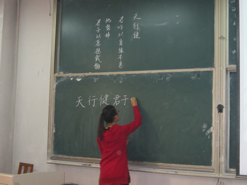 本次比赛共分为三个环节,第一环节为现场展示,参赛选手在黑板上书写自己的作品,同时工作人员在大屏幕上播放选手制作的粉笔字幻灯片。选手们各有千秋书写,作品规范整齐、美观大方。第二环节为抽签答题,参赛选手分为两人一组,从《论语》中选择要回答的题目,将句子补充完整并写在黑板上。最后一环节为加时赛,由三组平分选手参加。