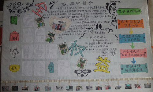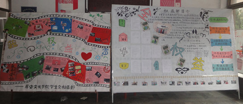“全心权益”维权体系围绕同学们的校园生活开展了丰富多彩的维权系列活动。进行“3·15”维权日问卷调查和新生问卷调查活动,汇集同学们的各类权益问题并进行了回馈解答;举办手抄报DIY比赛,既丰富了同学们的课余文化生活,也增长了同学们的权益法律知识;在文史楼宣传板张贴“贴心小提示”,对同学们提出有益身心的生活小建议,使同学们感受到院系的关怀与温暖;每月召集各班维权负责人开会,及时地反映同学们的权益新问题,并由各班维权负责任组织播放维权系列电影,在娱乐中提高了大家的维权意识和权利意识。此外,权益部通过建立电子信箱、设立维权信箱等方式完善了维权沟通渠道,加强了与同学们的沟通和联系,将维权落到了实处。