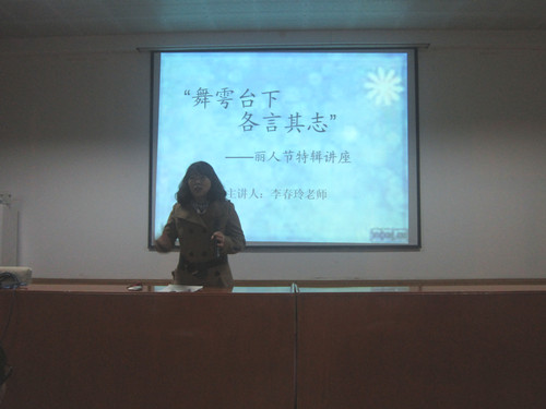李春玲老师从自身经历出发解析何为“修养”,讲述女性在具备知识、技能培养的生存能力的同时,应该培养对生活、工作、人生的积极生命态度。她指出修养不仅包括知识技能等社会生存能力的培养更包括了人对待工作生活人生生命的态度。李老师在分析了生活中关于修养问题的误区的同时,也提出修养的提高需要通过广泛阅读文史哲类书籍的途径。活动后期,李老师针对在座同学提出的如何看待别人是否有修养、有修养是否就是要做淑女等问题进行解答。进一步阐述当代女性应在协调各方面关系的同时,加强对自身修养的养成。