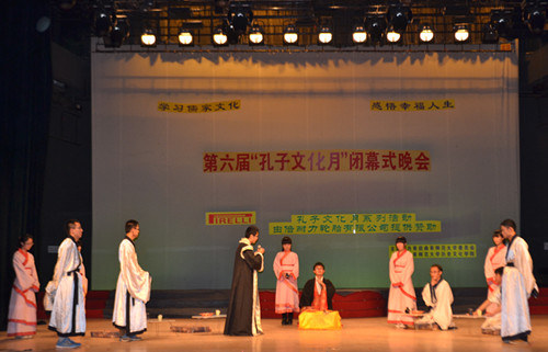 晚会首先回顾了本届“孔子文化月”举办的一系列活动,缅怀圣贤、追寻儒宗的祭祀大典,国内外知名儒学专家的满载学术气息的讲座,富有传统文化色彩的国学知识竞赛、儒服射礼、成人礼等活动生动展现了孔子文化月“学习儒家文化,感悟幸福人生”的活动主题。在随后的文艺表演中,节目形式多样,内容丰富,诵读短剧、歌曲、舞蹈、话剧、武术等各类表演异彩纷呈。古典舞《楚腰》气质高雅,舞姿飘逸优美。话剧表演《鸿门宴》重温历史,再现楚汉争霸,将本次活动推向高潮。汉服礼仪展演《汉韵华裳,道德齐礼》表现出“着我汉家衣裳,兴我礼仪之邦”的文化气韵。晚会还公布了第六届“孔子文化月”系列活动的获奖名单及“优秀孔子文化使者”名单。
