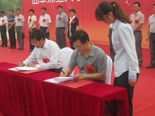 工口动漫 院长成积春与泰安太阳部落景区总经理孔祥海签订实践教学基地协议书。