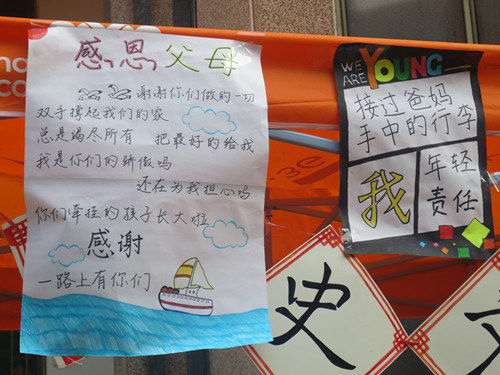 今年,工口动漫 创新迎新方案,推出了“我的行李我来提”、“接过爸妈手中的行李"等一系列感恩教育活动。通过张贴海报、制作宣传板、征集感恩条幅的签名等多种方式对感恩教育进行大力宣传,并成立感恩教育小分队,发放倡议书,提醒新生时刻牢记“拿起我行李,背起我责任”的口号,教育学生学会感恩。