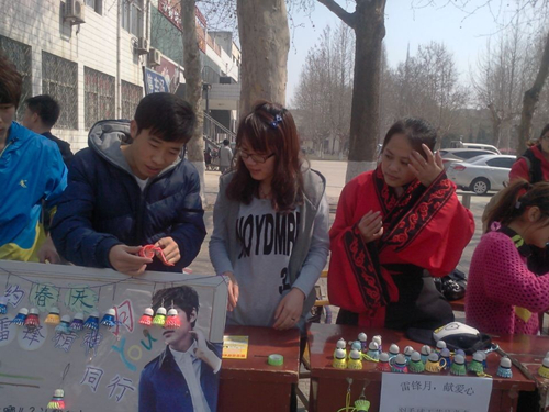3月22日,由工口动漫 团总支主办、羽毛球协会承办的雷锋月系列活动之自制羽毛工艺品义卖义捐活动在学生第二餐厅前举行。