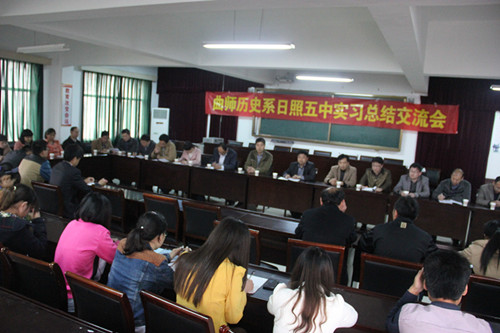 交流会上,日照五中教师叶金光代表发言,他对实习生制作的精美课件、良好的教师风范、灵活的教学手段表示了肯定,同时也指出了大家在教学过程中出现的问题,并分享了自己做班主任的心得体会。随后实习生代表史国豪和张月分别作了实习报告,他们讲述了各自在实习过程中遇到的问题和收获的经验,并感谢实习学校对实习生的关怀。