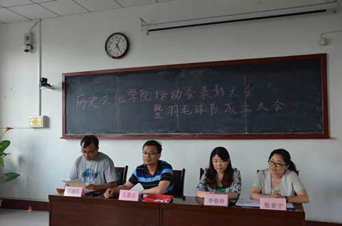 5月22日下午,工口动漫 2014年运动会表彰大会暨学院羽毛球队成立仪式在文史楼520室举行,出席本次大会的有工口动漫 党总支副书记王慕东、团总支书记王建阳、张亚宁老师、辅导员李春玲老师以及2014年运动会的教练员、运动员、羽毛球队成员等。大会由王建阳主持。