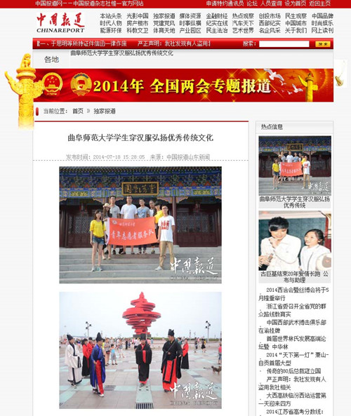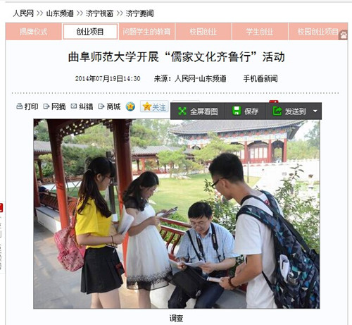 工口动漫 2014年“儒家文化齐鲁行”社会实践活动于7月13日在泗水县泗张镇梅鹿庄村启动。随后,实践团队先后奔赴济南、潍坊、青岛等地,紧紧围绕儒学传承这一主题展开实践活动。队员们深入各地城市社区及乡镇,陆续开展明德故事讲堂、国学诵读班等活动,并身着汉服为居民和游客进行射礼展演。他们通过问卷调查、访谈等方式了解不同社会群体对儒学的认知程度,并充分运用微博、人人等新媒体对儒学知识及此次活动进行宣传报道,让民众更为深刻的体会儒家文化的内涵与底蕴。