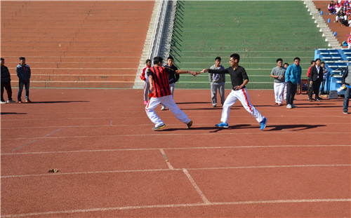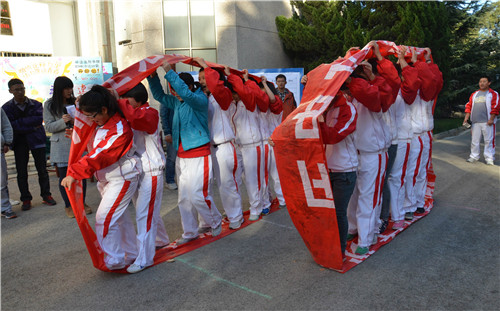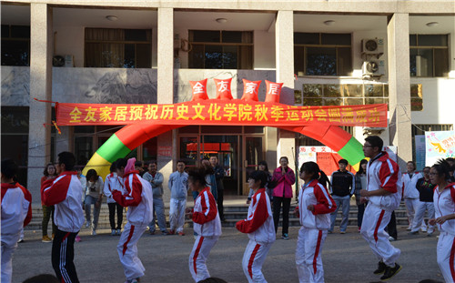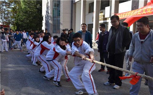 下午,作为秋季运动会一部分的趣味运动会在文史楼前举行。趣味运动会共设拔河、跳大绳和“坦克大战”三个比赛项目,2013级和2014级各班均派出队伍参加三个项目的角逐。队员们全身心地投入到比赛当中,充分享受着运动带来的快乐。正式比赛结束后,工口动漫 教师和主席团成员们也参与到了跳大绳的比赛当中。师生一同体会了趣味运动会的乐趣。现场气氛欢快活跃,师生其乐融融。