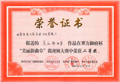 历经一个多月的初期筛选、网络投票、专家评审等环节,工口动漫 高杨、马文帅、邓彭辉同学制作的微视频《美丽新曲阜》以丰富的表现形式,饱满的主题内容,细腻的拍摄手法,展现了从古至今曲阜市的巨大变化,通过“德、智、礼、孝”四个方面体现了优良的传统和淳朴的民风,从众多参赛作品中脱颖而出,成为评选出的11部获奖优秀作品之一,并荣获二等奖的好成绩。
