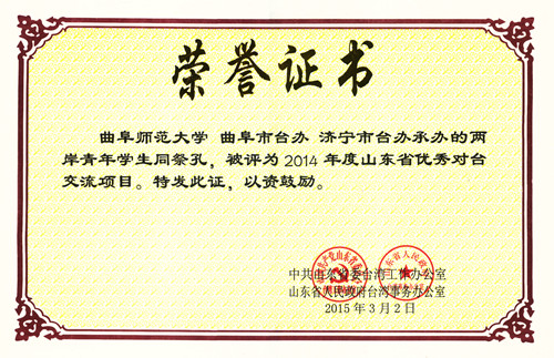 近日,我校与曲阜市台办、济宁市台办共同承办的“两岸青年学生同祭孔”活动荣获山东省2014年度优秀对台交流项目。 该奖项由中共山东省委台湾工作办公室、山东省人民政府台湾事务办公室联合颁发,旨在表彰为海峡两岸和平发展、经贸合作、文化交流等作出突出贡献的项目。