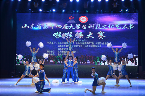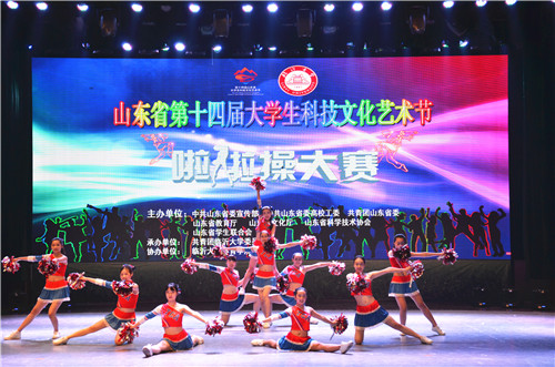 6月6日,在山东省第十四届大学生科技文化艺术节啦啦操大赛中,工口动漫 与体育科学学院代表队代表我校赴临沂大学分别参加普通组花球啦啦与专业组花球啦啦比赛。