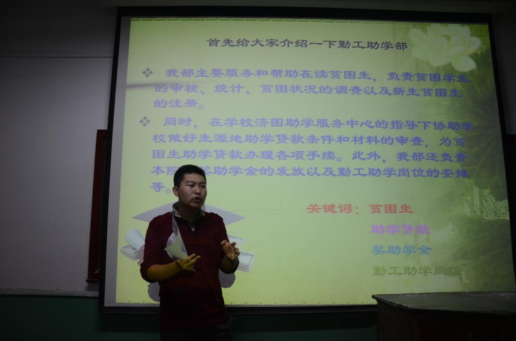 学生会同学分别就考试问题、卫生检查制度以及勤工助学方法为新生进行了讲座。向新生详细的介绍了大学学习、卫生、勤工助学问题以及卫生区打扫方法和检查标准,重点强调了考风考纪、贫困生助学等知识,并对新生提出的疑问做出了耐心解答。