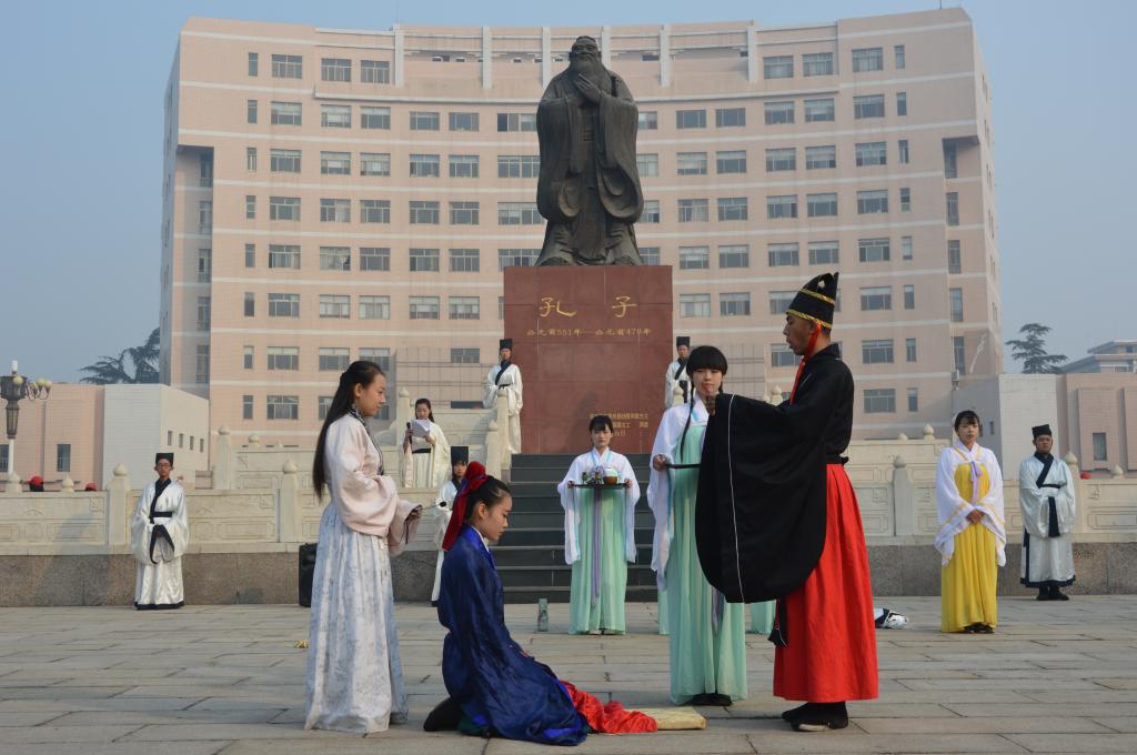 此次展演由冠礼、笄礼、拜师礼和射礼四部分组成。一段精彩的汉舞表演过后,礼仪展演依次进行。展演结合古典的音乐与传统的儒服,再现了古代儒家传统礼仪的仪式过程,传达了仪式背后所蕴含的文化精神。传统礼仪展演吸引了参加校庆大会的校友、国际友人驻足观看。