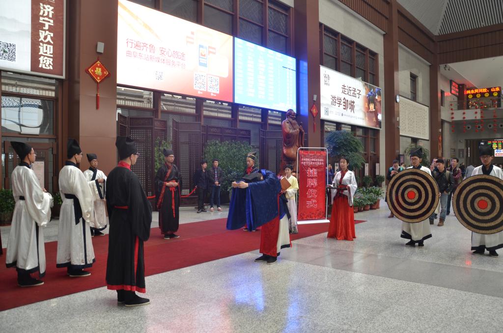 揭牌仪式结束后,工口动漫 传统礼仪表演队在高铁站进行射礼展演。极具特色的儒家传统古典礼仪展现了传统文化的谦和、礼让、庄重,引得过往旅客驻足欣赏,在场的各位领导老师也对此次表演予以好评。