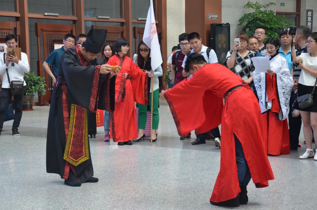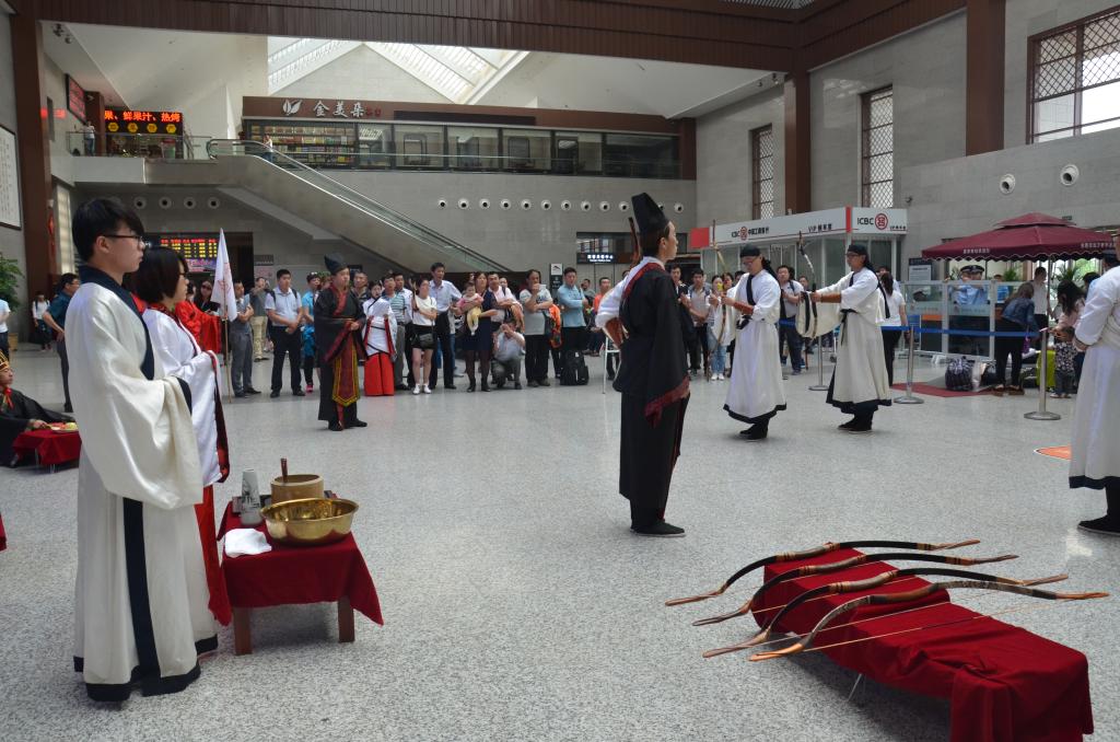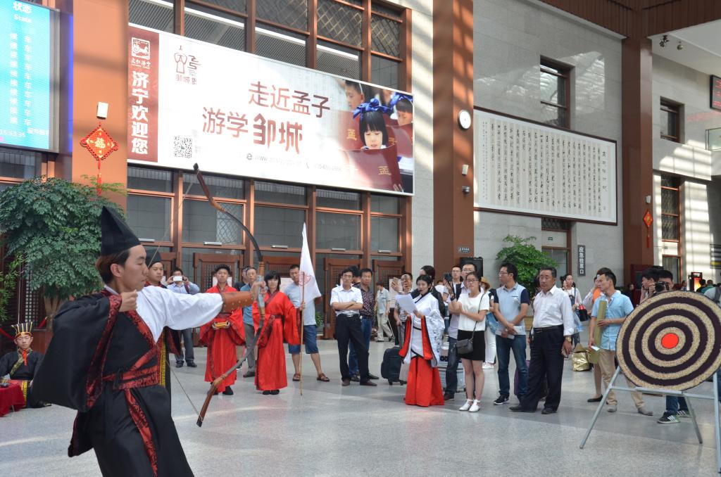 5月30日,工口动漫 传统礼仪队在曲阜东站进行射礼展演活动。新华网、人民网、大众日报、山东广播电视台、中国山东网等十几家媒体记者对活动进行了报道。 演出中,工口动漫 工口动漫 礼仪队成员身着儒服,复原明代的乡射礼仪。整个礼仪由迎宾、酬宾、扬觯、一番射、算获、旅筹和送宾七个环节组成。同学们按照明代李之藻的《頖宫礼乐疏》记载,展示了明代乡射礼的基本步骤。演出活动受到在场媒体与观众的一致好评。
