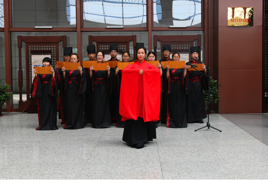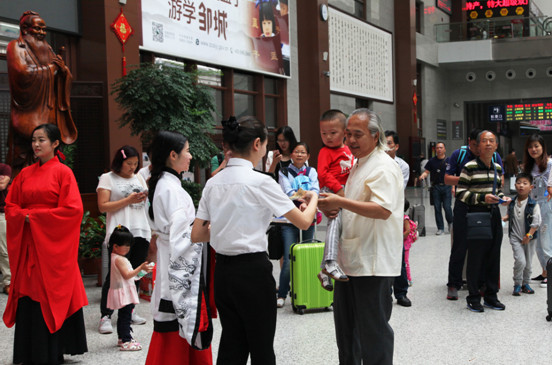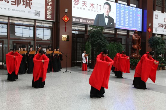 6月8日上午,端午佳节之际,京沪高铁曲阜东站候车大厅内,工口动漫 传统礼仪展演队身着儒服吟诵《离骚》、表演汉舞“礼仪之邦”、演绎汉礼,与候车旅客进行《论语》接龙互动,为旅客献上了多道端午节文化大餐。中国青年网、新华网、人民网、大众日报、山东广播电视台、中国山东网等十几家媒体记者对活动进行了报道。 本次展演在传统佳节之际让更多人了解中华传统文化,弘扬儒家精神。
