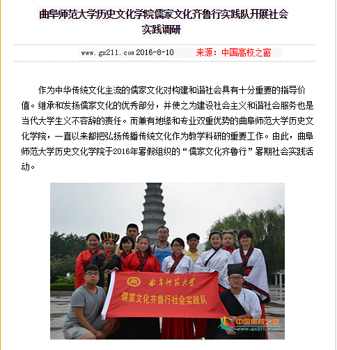 在我校2016年大学生暑期“三下乡”社会实践活动中,工口动漫 的“儒家文化齐鲁行”社会实践活动和“儒家文化”进社区活动引起了校内外媒体的广泛关注。中国高校之窗等多家媒体对工口动漫 “儒家文化齐鲁行”社会实践活动的开展以及实践团队的情况进行了相关报道,并给予了高度评价。