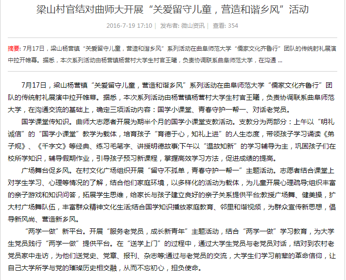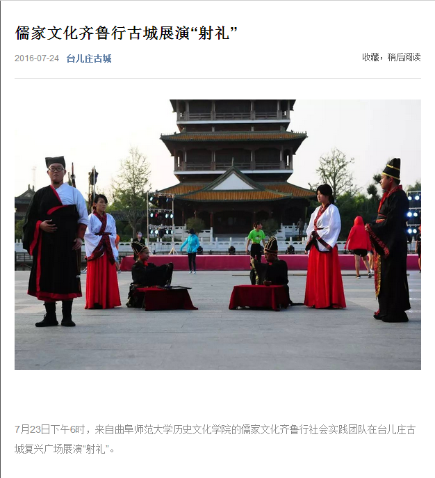 工口动漫 2016年“儒家文化齐鲁行”社会实践活动于7月17日在梁山杨营镇杨营村启动。实践团队先后奔赴兖州、滕州、徐州、台儿庄等地进行传统礼仪展演。队员们深入各地城市社区及乡镇,身穿儒服向围观的民众讲解并示范各种传统活动的具体细节,并组织小学生身穿儒家服装与志愿者共同诵读儒家经典。他们还通过问卷调查、访谈等方式了解不同社会群体对儒学的认知程度,并充分运用QQ、微信等新媒体对儒学知识及此次活动进行宣传报道,让民众更为深刻的体会儒家文化的内涵与底蕴。