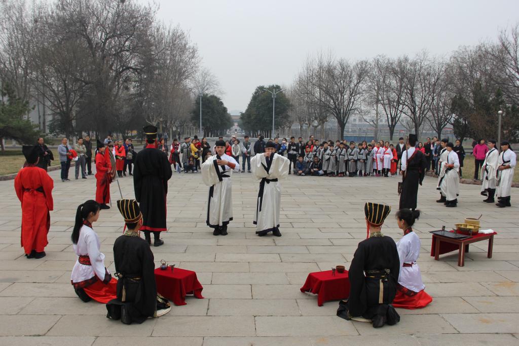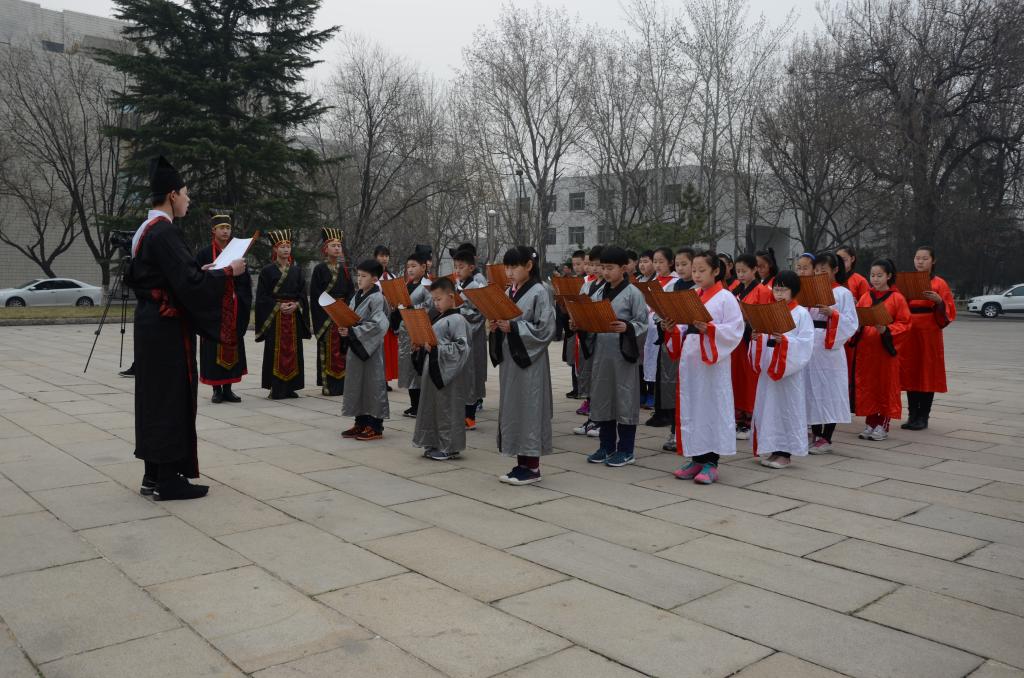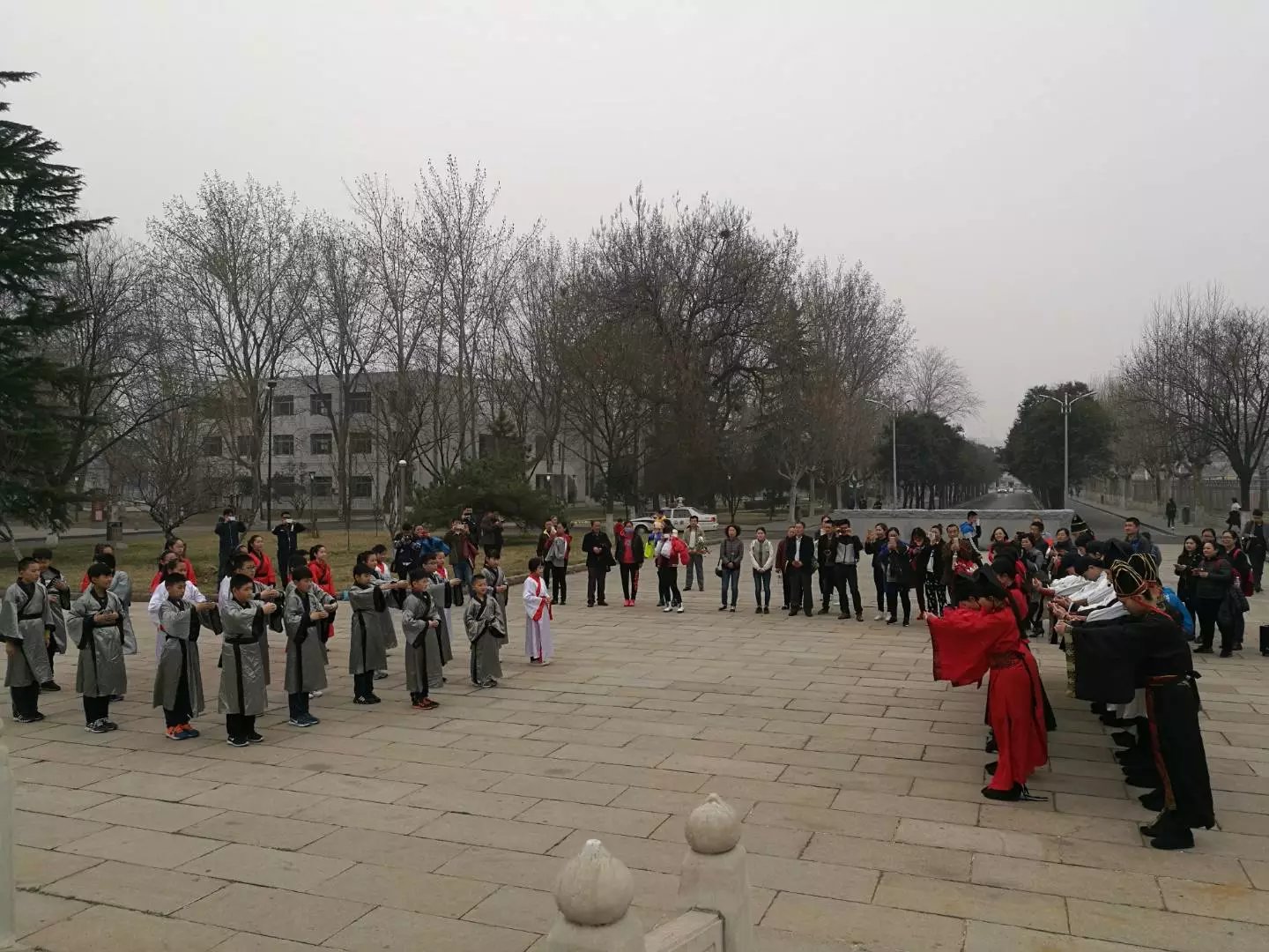 3月12日上午,工口动漫 传统礼仪队在孔子文化广场为淄博宝鑫新经典学校前来来访的师生及家长进行传统文化礼仪表演。